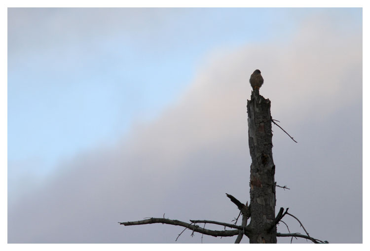 14 september. Det har setts åtskilliga tornfalkar på senaste tiden. Idag vid åttatiden fanns två tornfalkar på ett hygge sydost om Rössmåla. På kvällen fanns en gammal hanne kvar. Jag hoppades på att kvällssolen skulle tränga fram i någon molnspricka men så blev det inte. Men moln är ju i alla fall vackert kvällsrosa. |