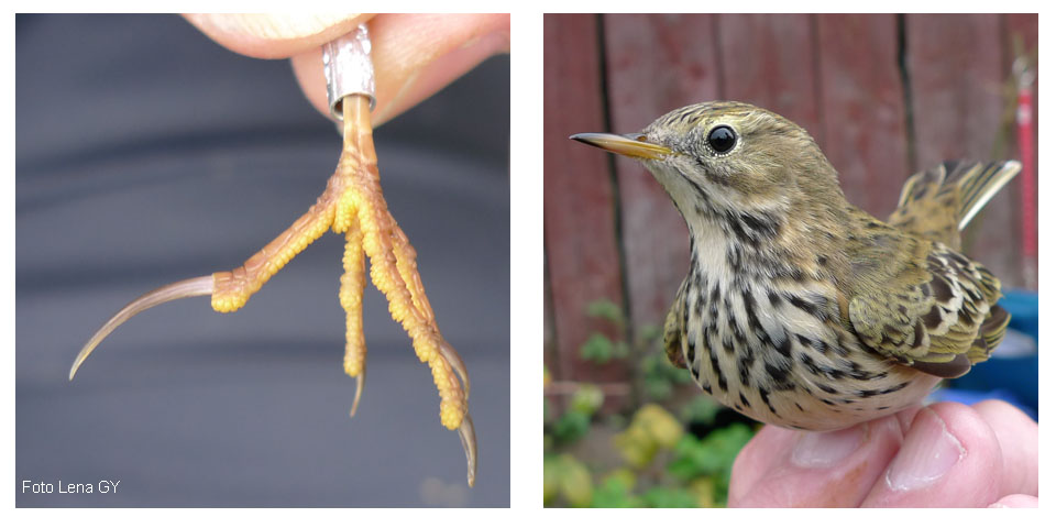 En annan udda art för dagen var ängspiplärka. En viktig skillnad mot trädpiplärkan är den långa bakklon. Fågelskådning med fåglarna i handen är annorlunda jämfört med kikarstudier. Men det är klart, den långa bakklon är en användbar detalj även för fältornitologen. |