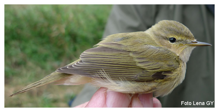 Vi fångade både lövsångare och gransångare, en av varje. Man kan skilja de två arterna, som ju är mycket lika varandra, på den inskärning som finns på handpennorna. Gransångare har inskärning på fyra av handpennorna. Lövsångare har det bara på tre handpennor. Lövsångare saknar inskärning på sjätte handpennan. Den högra bilden visar alltså lövsångarens vinge, den vänstra är gransångarens vinge. |