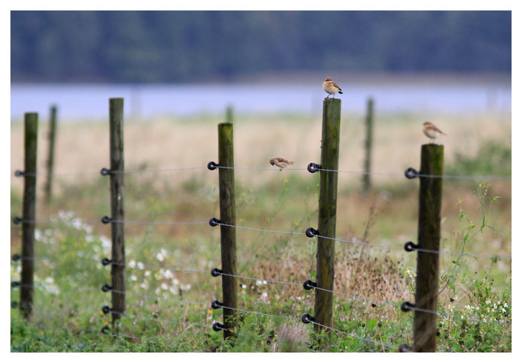 22 september. Regnet satta stopp för dagens ringmärkning. Det fick bli vanlig skådning istället och det är fantastiskt kul det också. Södra delen av Lidhemssjön är ofta spännande. Idag var det väl inget speciellt men bilden visar två av fyra stenskvättor och på tråden en hämpling. |