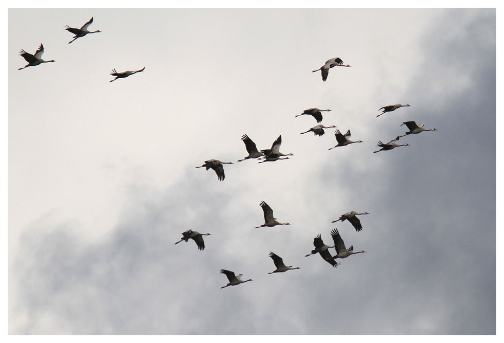 Vid Kubbö rastade 30 tranor. De höga mörka molnen skapade lite dramatiska bakgrunder till flocken när den lyfte. |