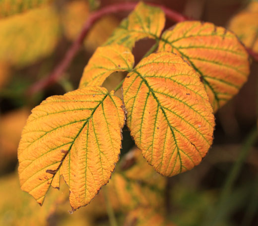 | Hallonbusken intill ringmärkningsbordet har fått sina höstfärger. |