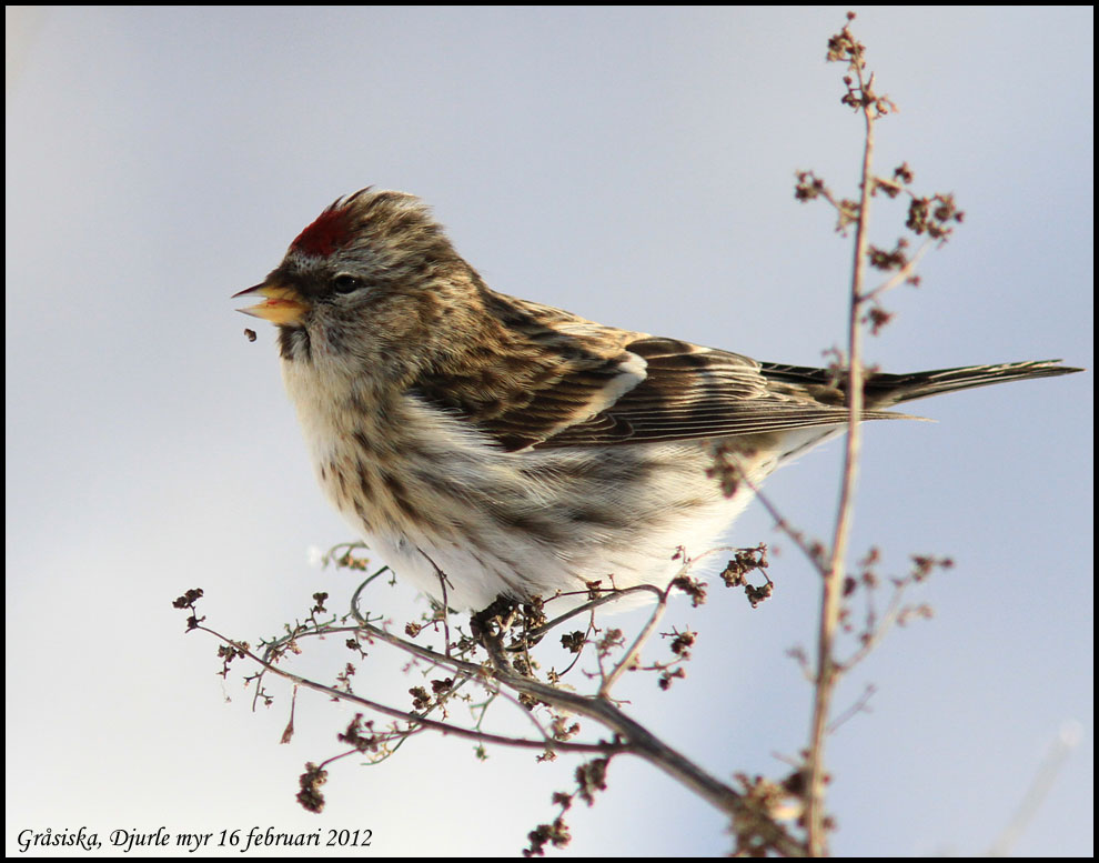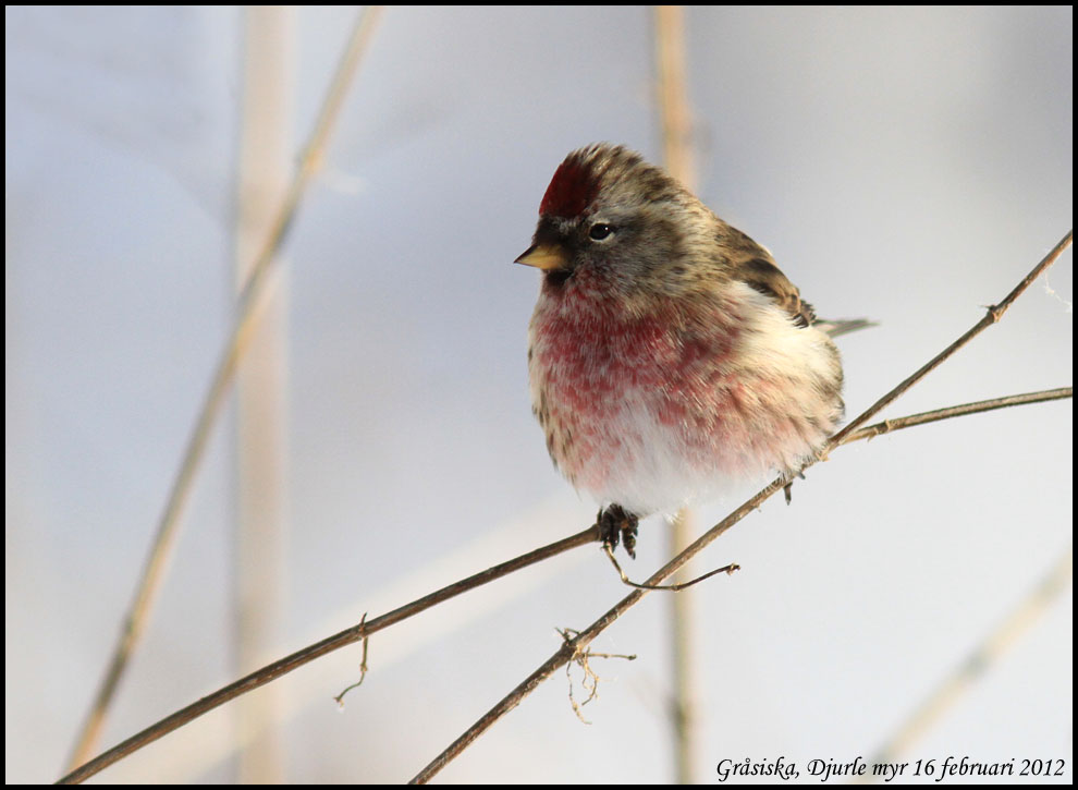16 februari. Strålande sol och 5-6 minusgrader. Det har kommit mer snö så nu har vi nog fått 20 cm minst. På Djurle myr intill allén fanns tre orädda gråsiskor. Kul att plåta siskor i snö och bra ljus. |