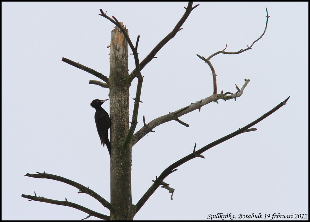 19 februari. Plusgrader idag. Snötäcket sjunker ihop snabbt, påskyndat av bristen på tjäle. Jag gick en skogsväg norr om Botahult. Två spillkråkor hade ivriga diskussioner om något. |