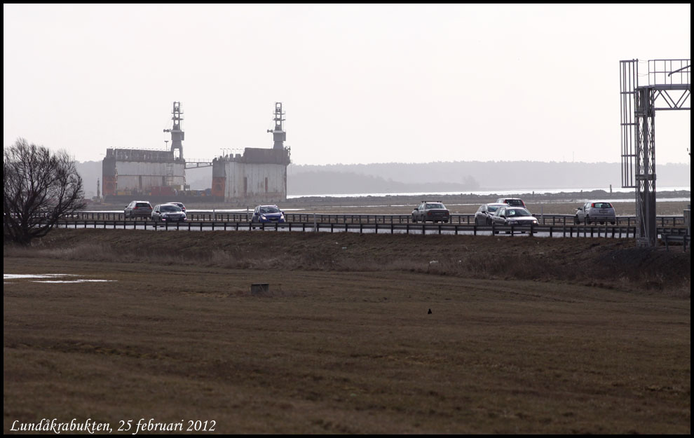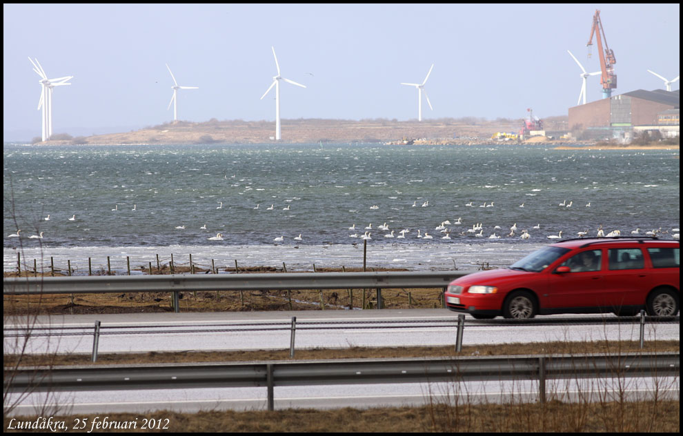 Huvva så trängda fåglarna är i det moderna samhället. På ena sidan strandängarna och det grunda havet rusar trafiken fram på E6an, på andra sidan vindkraftverk, soptipp och hamnindustrier. Och i söder en strandad reparationsdocka med grävmaskiner och transportfordon. Borde inte kustmiljöerna vara värda ett bättre öde? |