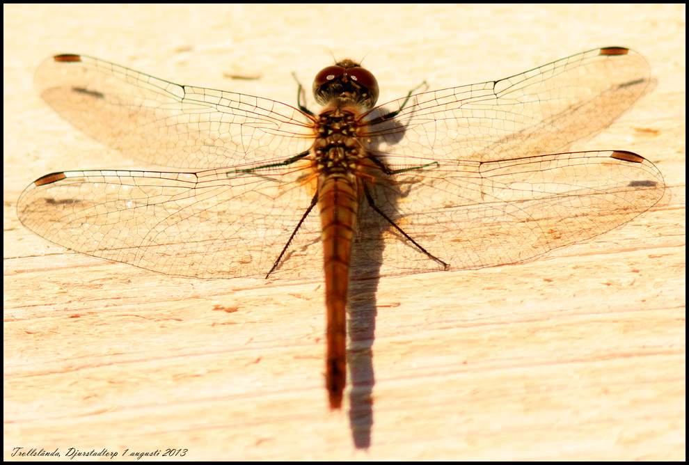 1 augusti. Trollslända i kvällsljus vid Djurstyadtorp. |
