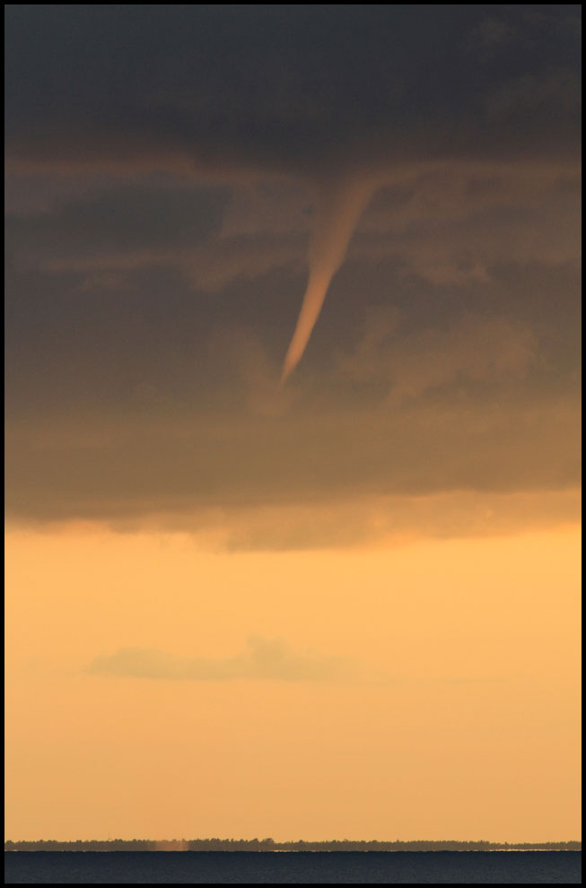 | 24-25 augusti. Vad är detta? Sågs över Kalmarsund på lördagskvällen. En tromb eller? Lägg märke till detta ljusa partiet över vattenutan. |