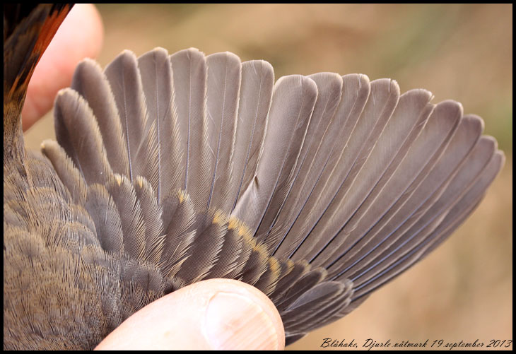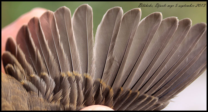 | 5 september. Mitt första besök för året vid Djurle våtmark resulterade i en blåhake, den första på två år. Det var en ung hanne. Observera skillnaden mellan de tre inre armpennorna och de sex yttre. |