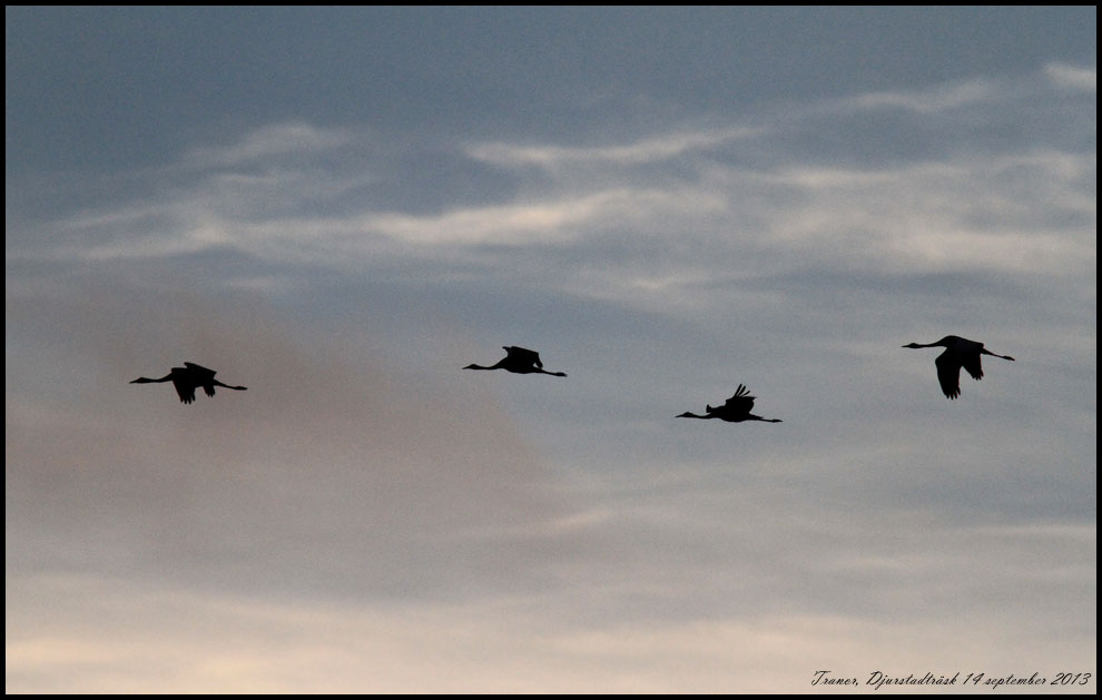 elda någon längre stund! Vi tog en promenad till fågeltornet vid Djurstyadträsk. En grupp tranor passerade i kvällsljuset. |