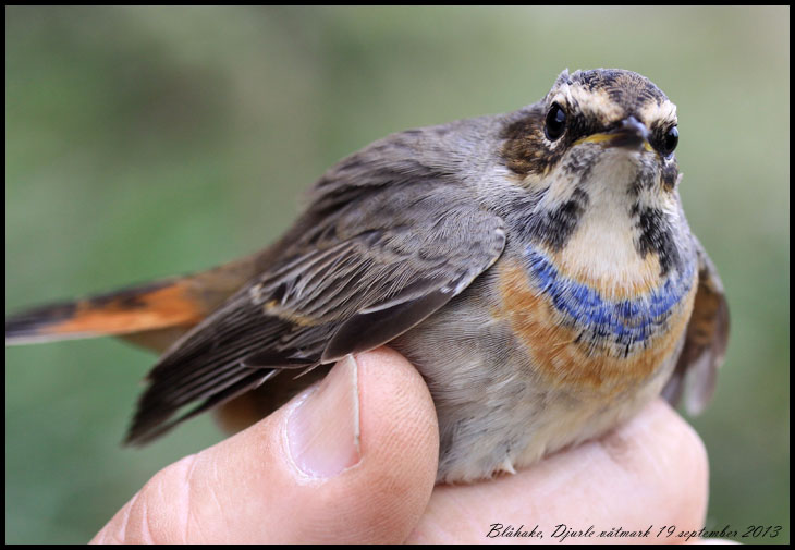 | 19 september. Femte blåhaken fångades idag vid Djurle våtmark. En unge hanne med åtta juvenila armtäckare. |