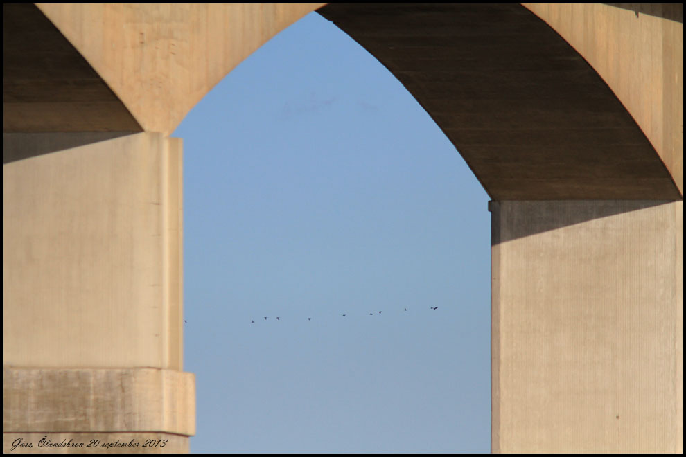 20 september. Fredag och tillbaka till stugan på Öland. Vi fikade vid Ölandsbron fäste på kalmarsidan. Gäss sträckte på på andra sidan sundet. Utan tuben är det osäkert vad det var möjligen prutgås. |