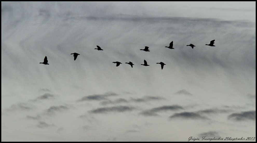 25 september. Kvällspromenad ner till Froarydsviken. En grupp grågäss kom förbi från norr. Intressanta moln! |
