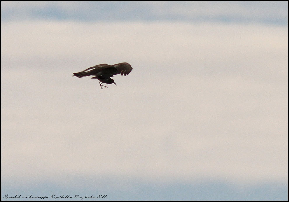 Några minuter senare fick en av kärrsnäpporna resa till himlen med hjälp av en sparvhök. Den kom otroligt snabbt och snett från sydväst så solen måste ha bländat vadarna. De sista fem meterna dök den vertikalt och fick ett fast grepp på snäppan. |