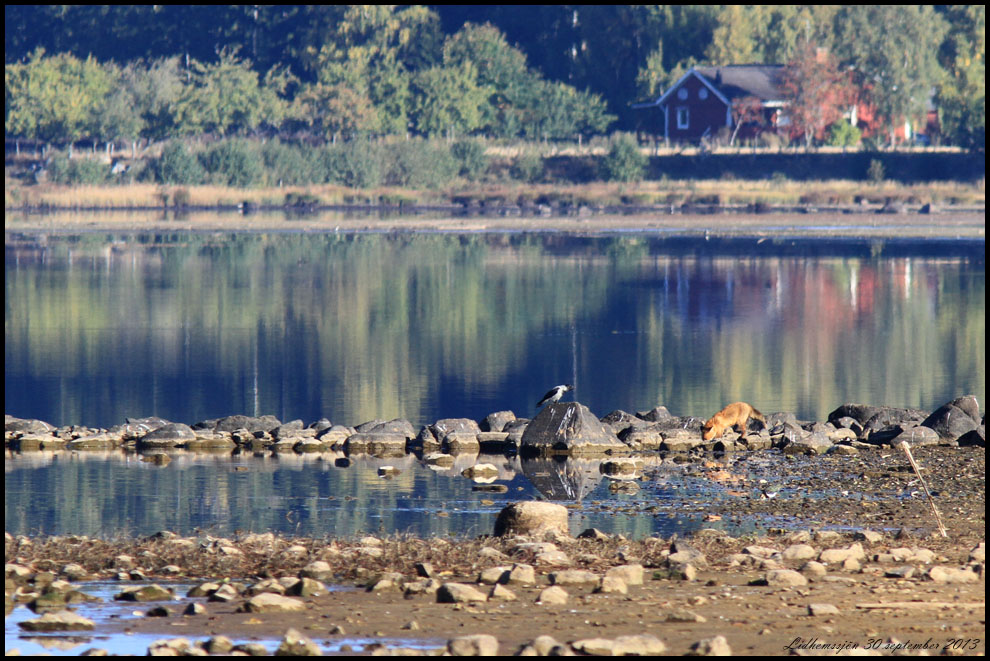 En räv undersökte stranden, ilsket påhejad av en kråka. Vattennivån är mycket låg efter en torr sommar och start på hösten.