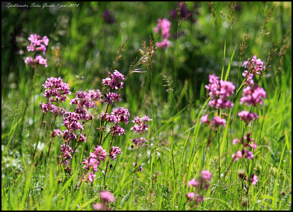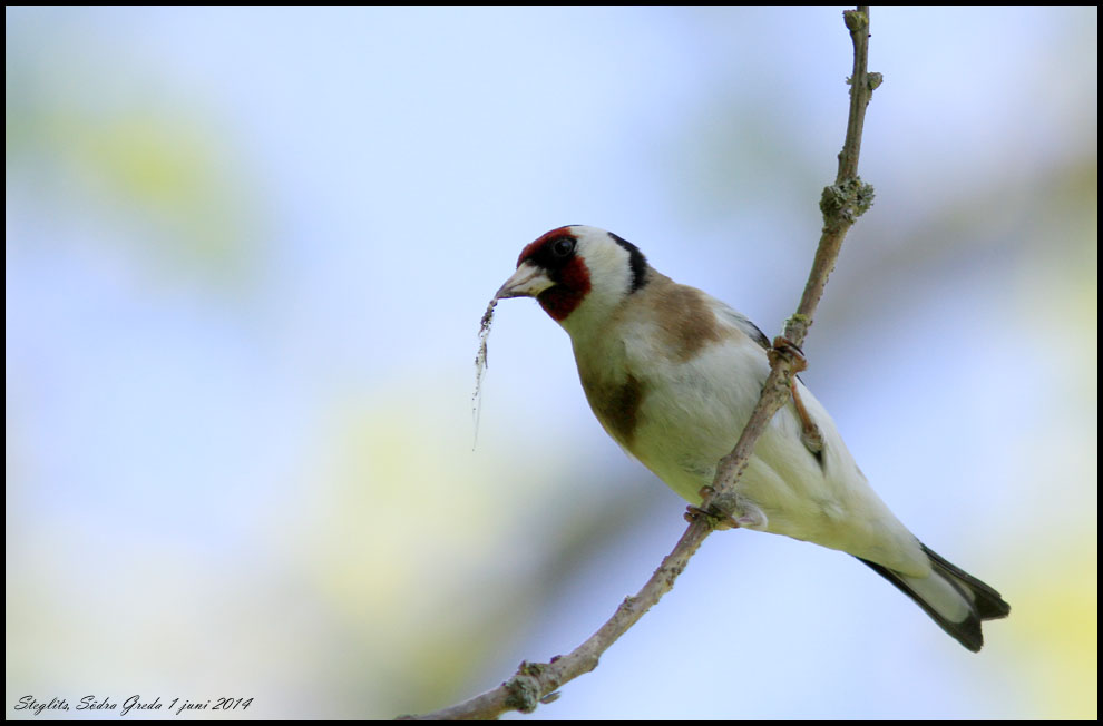 1 juni. På förmiddagen besökte vi naturreservatet Södra Gredda, känt för sin flora. Steglits bygger nog bo ser det ut som, det verkar vara spindelväv den har med sig. |