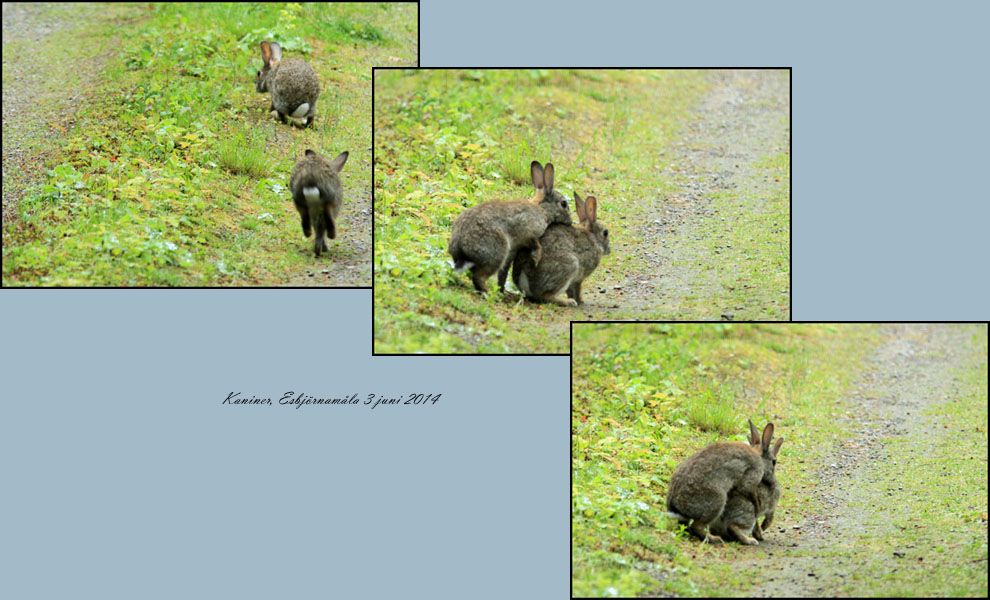 3 juni. Vi har förstås kaniner hemma på tomten men man ser dem inte så ofta. De här höll till alldeles framför huset så bilderna är tagna genom glasrutan. |