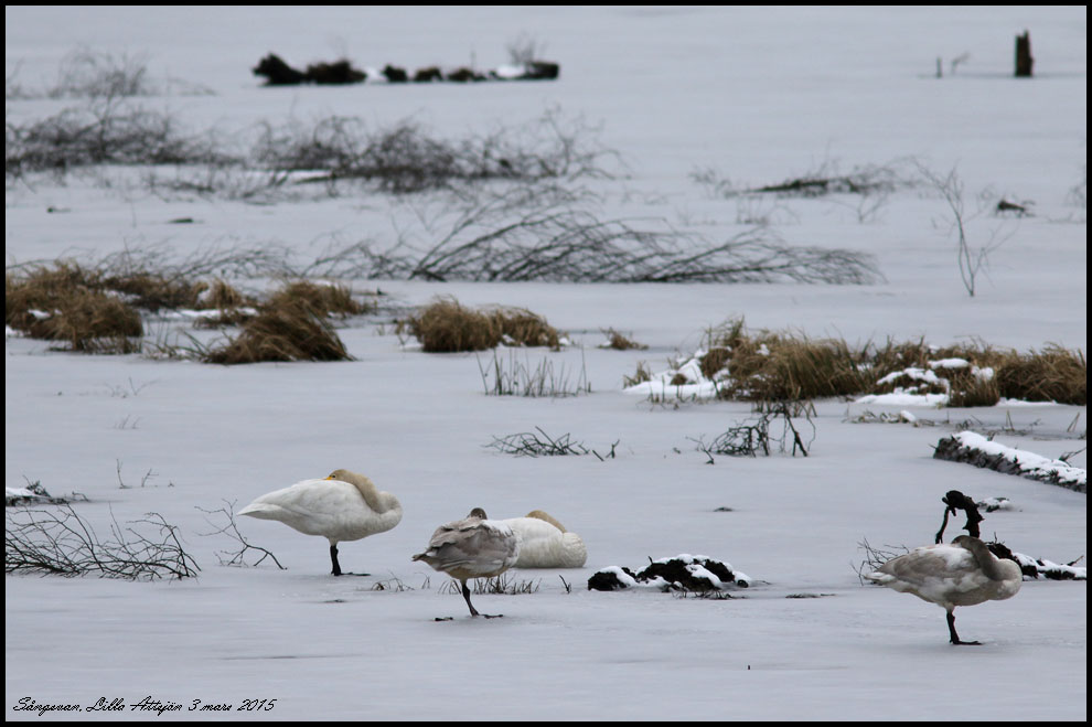 3 mars. Jag stannade till vid Lilla Attsjön. Isen ligger fortfarande men en familj sångsvanar vilade ut. |