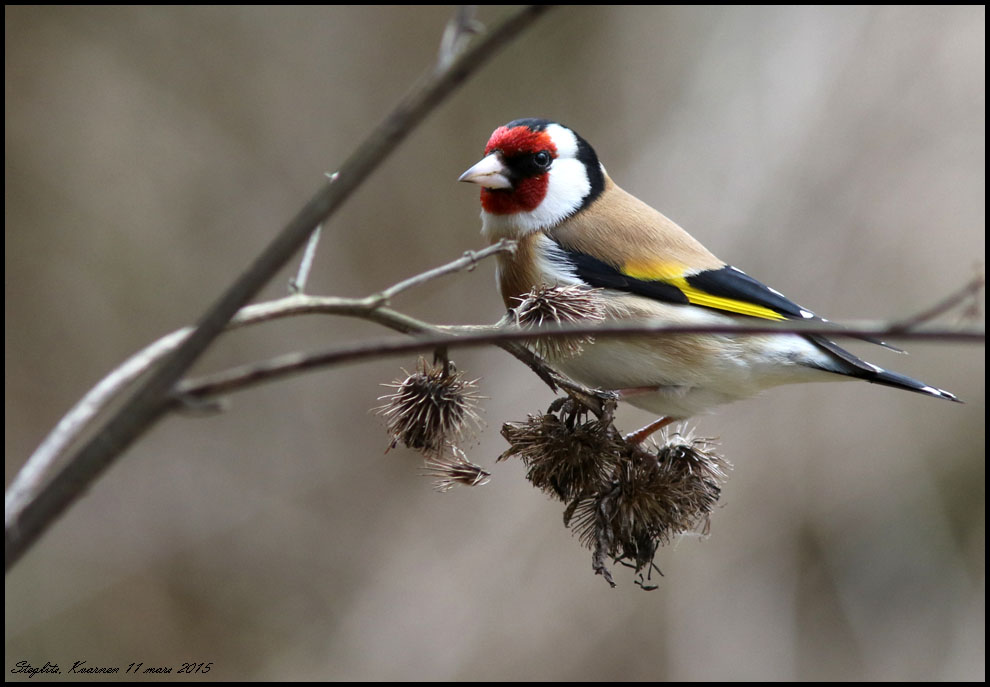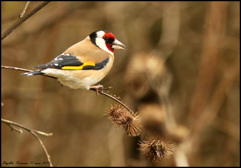 Igår fanns den här steglitsen intill den gamla kvarnen där den åt på kardborre från förra året. Jag gissade rätt när jag återvände idag för att få lite bilder. Den var lite tveksam inför min närvaro men några bilder blev det. |