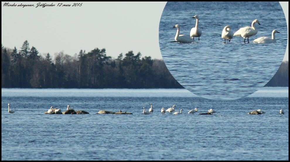 12 mars. På eftermiddagen rastade 12 mindre sångsvanar tillsammans med två sångsvanar. |