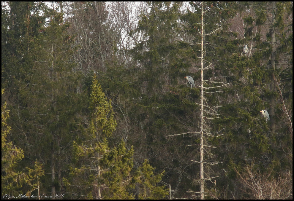 Fem hägrar satte sig i granarna längst in i viken. |