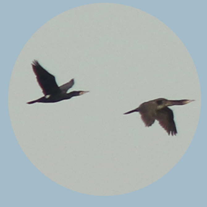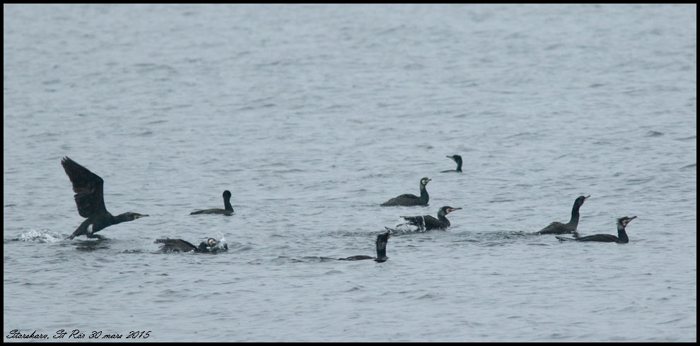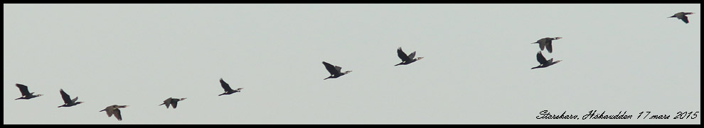 Årets första sträckande storskarvar passerade österut. Först tio, sedan trettio till. I den första gruppen var alla utom en i häckningsdräkt. |