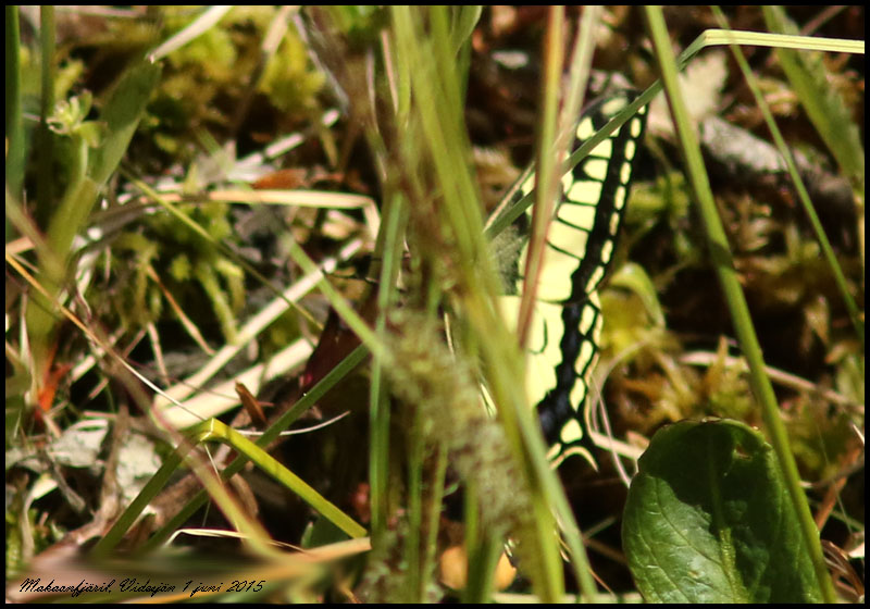 4 juni. Dagens runda gick hemifrån ut till Näsuddens spets. Väl hemma hittade jag en makaonfjäril bland blommorna på tomten. |