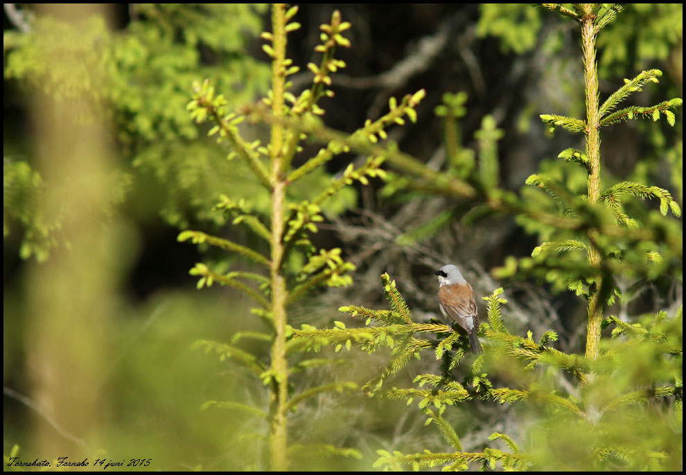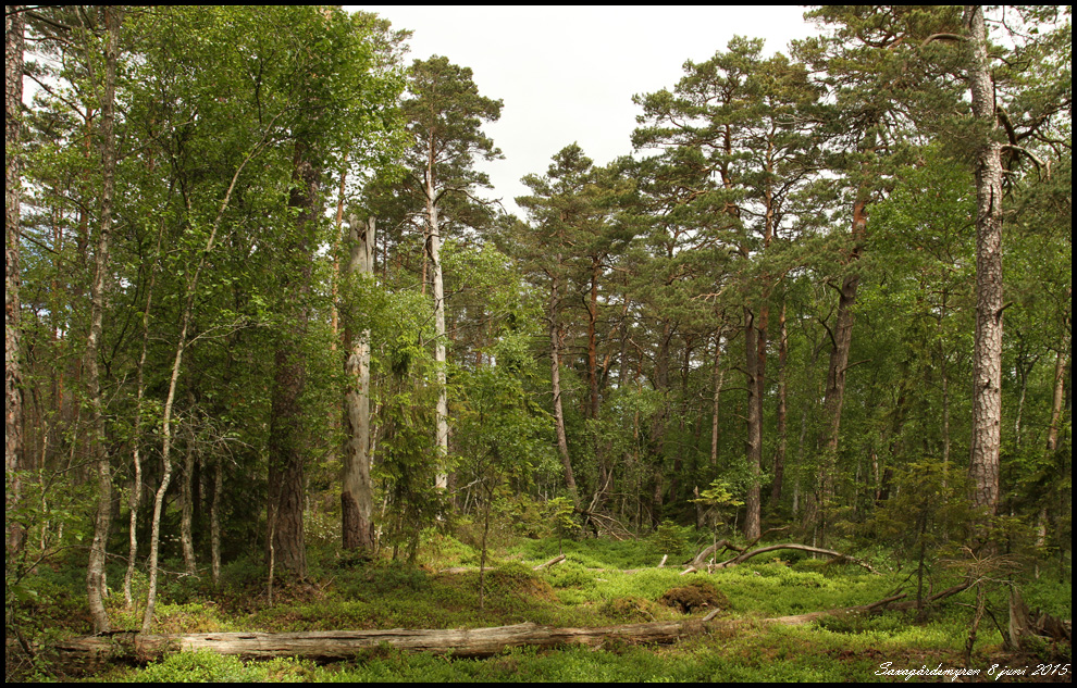 14 juni. Törnskata vid Fornebo. Ungskog med julgransstora granar. |