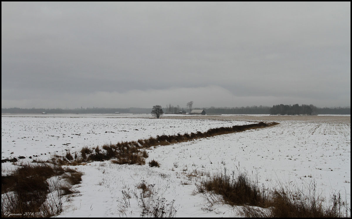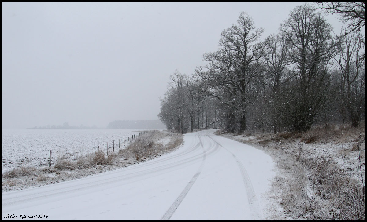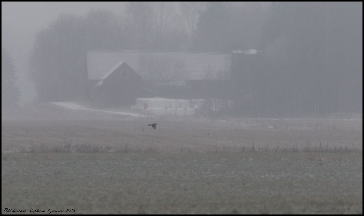 1 januari. Årets första dag bjuder på lätt blötsnö, dis och begränsad sikt. Blå kärrhökarna fanns kvar vid fälten mellan Lidhem och Kullarna men kungsörnen kunde vi inte hitta. |