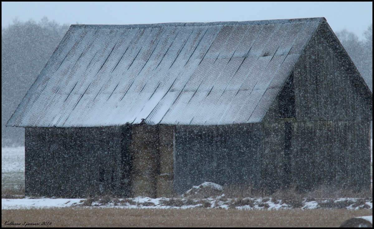 | 3 januari. Lite vintrigt nu! Några minus och lätt snöfall hela dagen. En lada vid Kullarna. Den blå kärrhöken jagade bortom ladan i snöfallet. | |