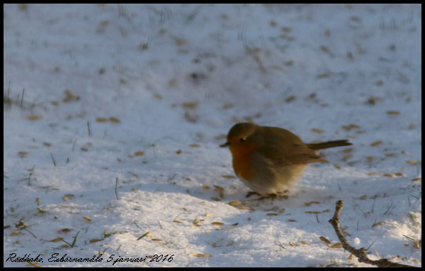 | 17 januari. Strålande vinterväder med lite skidåkning på programmet. Hemma vid fågelmatningen kämpar rödhaken på men den verkar må rätt bra. | |