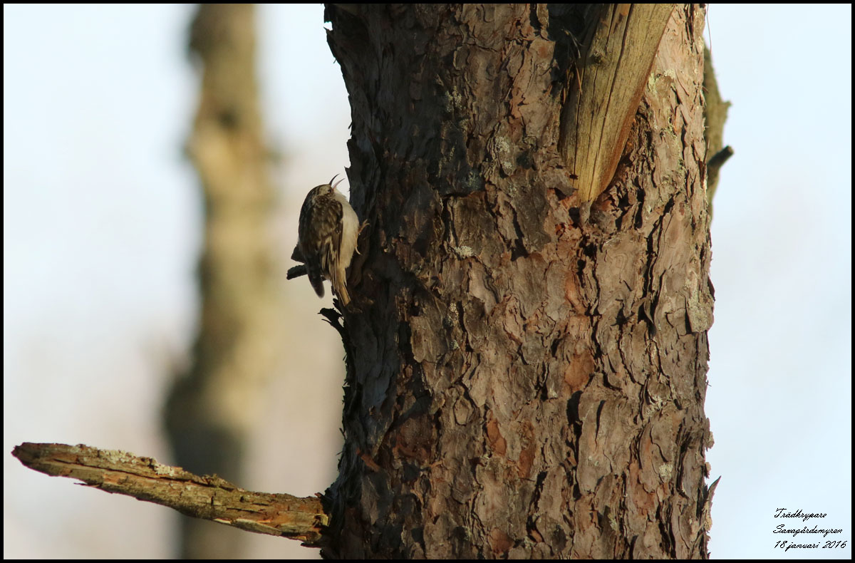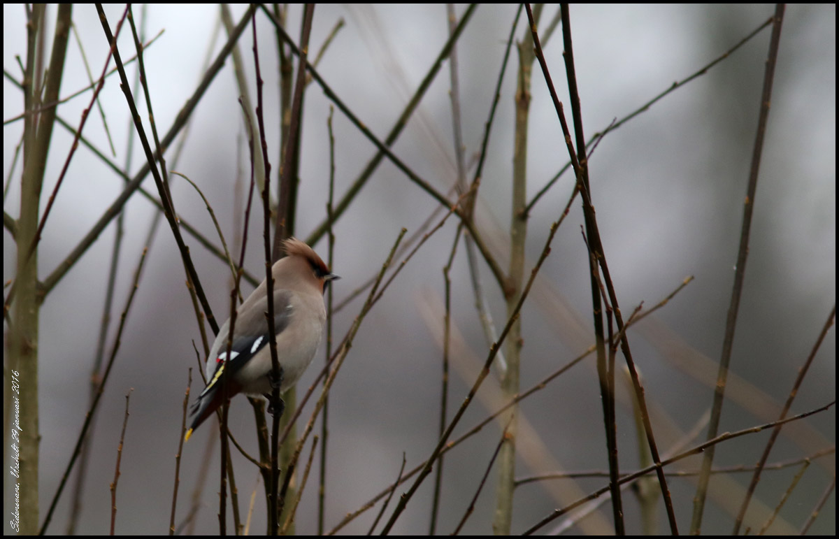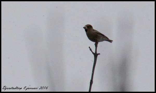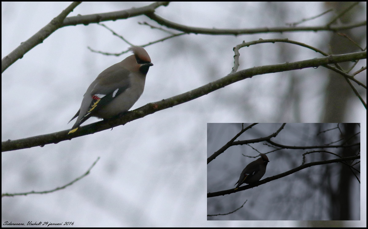 | 29 januari. Vi tog en promenad i Urshult för motionens skull. Men det blir ju fåglar också bl a sidensvansar. Ingen vidare skärpa men det är inte lätt med 1/60 sekund. | |