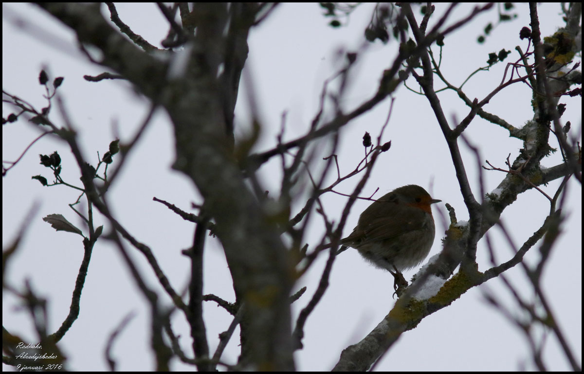 | På eftermiddagen fanns en rödhake hemma vid fågelmatningen. Det blir inte bra när man tar bilder i 45 graders vinkel genom dubbla glasrutor. |
