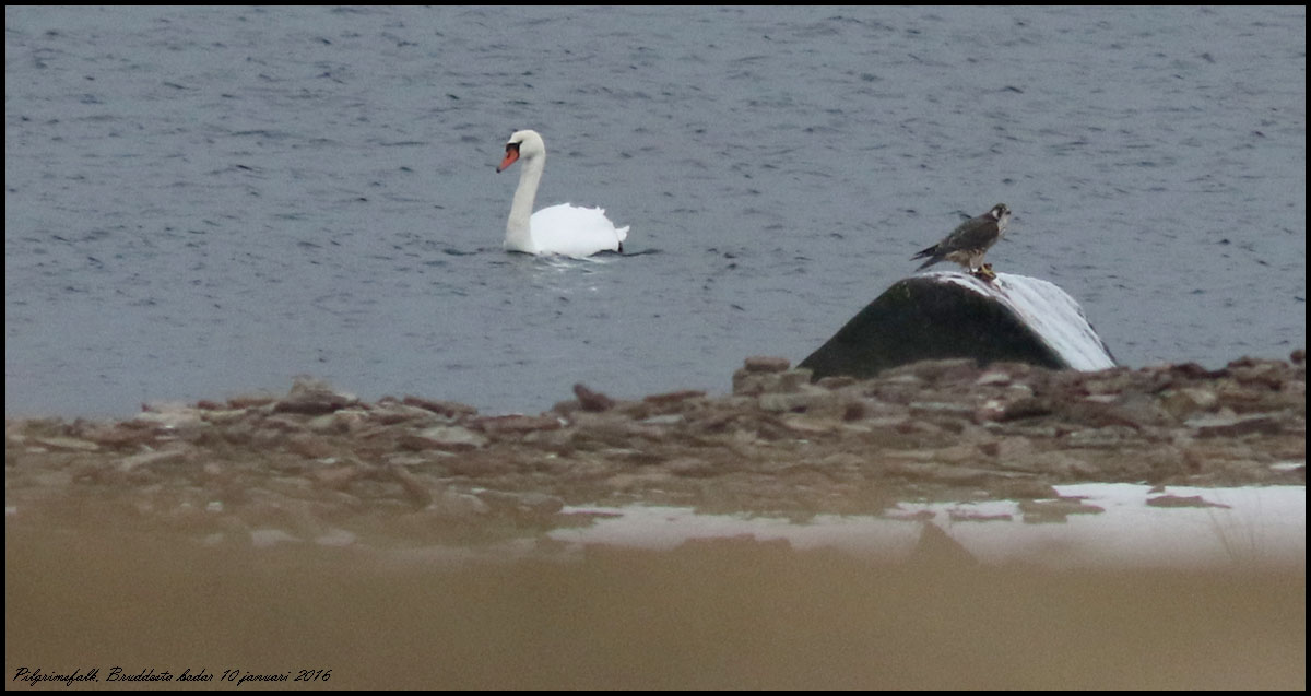 7 - 10 januari. Vi har varit några dagar på Öland. 10 januari. Besök vid Äleklinta och Bruddesta bodar. Inte så mycket fåglar att titta på men en flock björktrastar höll till söder om Bruddesta bodar. När jag just satt mig i bilen för att fara vidare kom hela flocken farande lågt över marken. Efter kom en pilgrimsfalk, helt nära mig och bilen, med ett byte i klorna. Falken försvann ner mot bodarna och en stund senare upptäckte jag den. Då satt den och åt på bytet. Det är en ung 2K falk med längsgående streck på bröstet och bruna bräm på översidans täckfjädrar. |