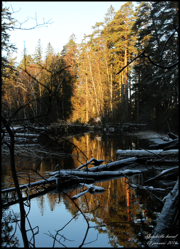 | 13 januari. Gårdagens gråväder nära nollan har ersatts av klart och kallt väder. Jag har gjort ett nytt besök vid Gräskulla kanal. |