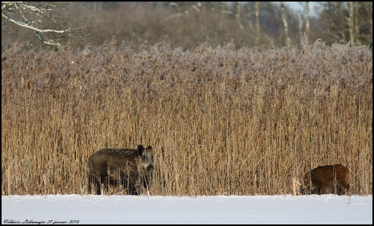 21 januari. Femton minusgrader idag. Aggån är i stort sett helt istäckt, likaså Lidhemssjön förstås. På sjöns västra sidan fanns mamma vildsvin med två ungar. De stod och njöt i solljuset. |