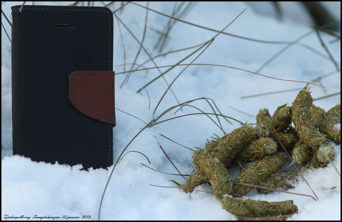 22 januari. Lite kul att pulsa runt i snö och skvattram uppe i Saxagårdsmyren. Rena träningspasset. Idag stötte jag tjädertuppar vid två tillfällen. Där den första flög upp fanns två rejäla, helt färska spillningshögar och spår i snön. Telefonen är 6,5 cm bred. |