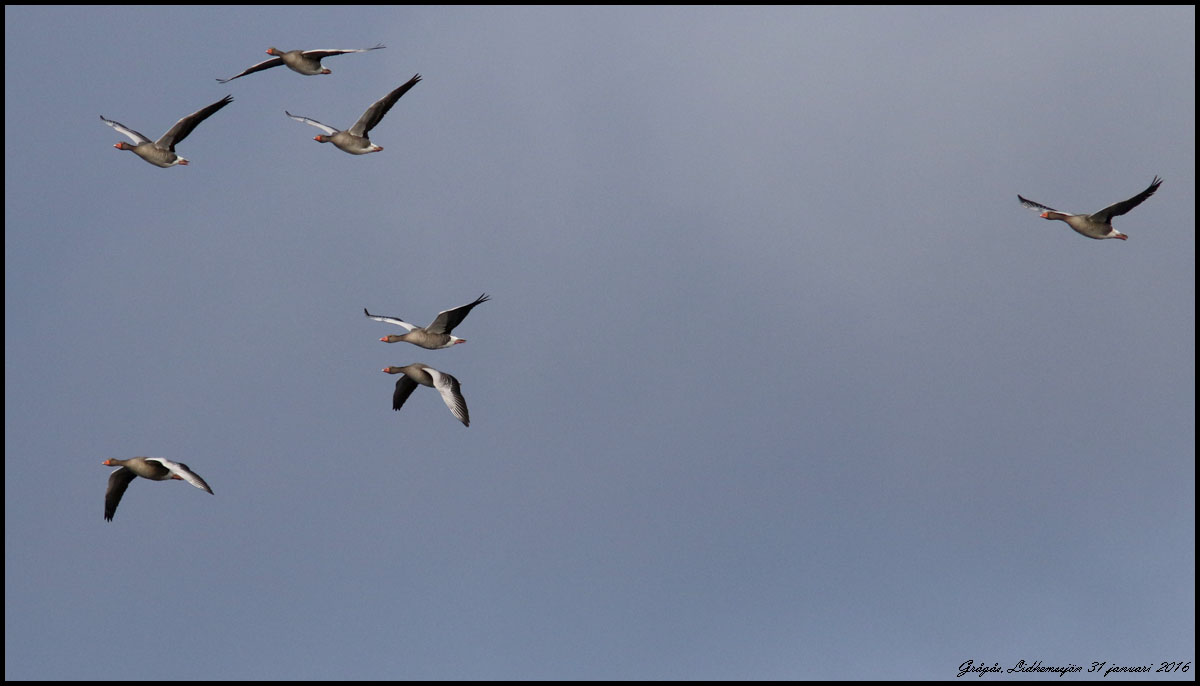 12 januari. Utflykt i lidhemsområdet. Minst 750 sädgäss fanns norr om Lidhem och bland dessa också två spetsbergsgäss. |