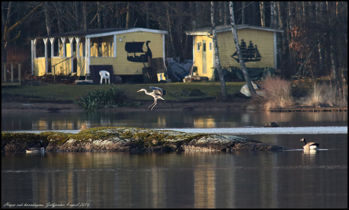 Två hägrar kom över hela Jätfjorden och landade sedan. Men det gillade inte kanadagåsen som gick till anfall direkt. |
