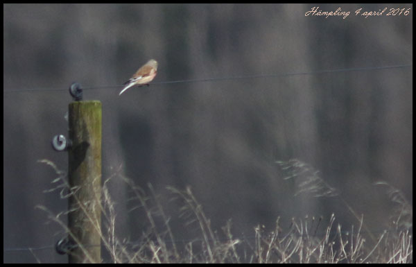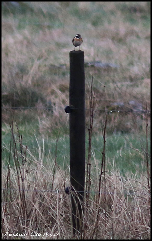 19 april. Sol och regn om vartannat. Och friska, hårda vindar. Besöket på Hökaudden gav inte så mycket men vid Kubbö fanns årets första buskskvätta. Bilden är kraftigt croppad men återger fågeln förvånansvärt bra. |