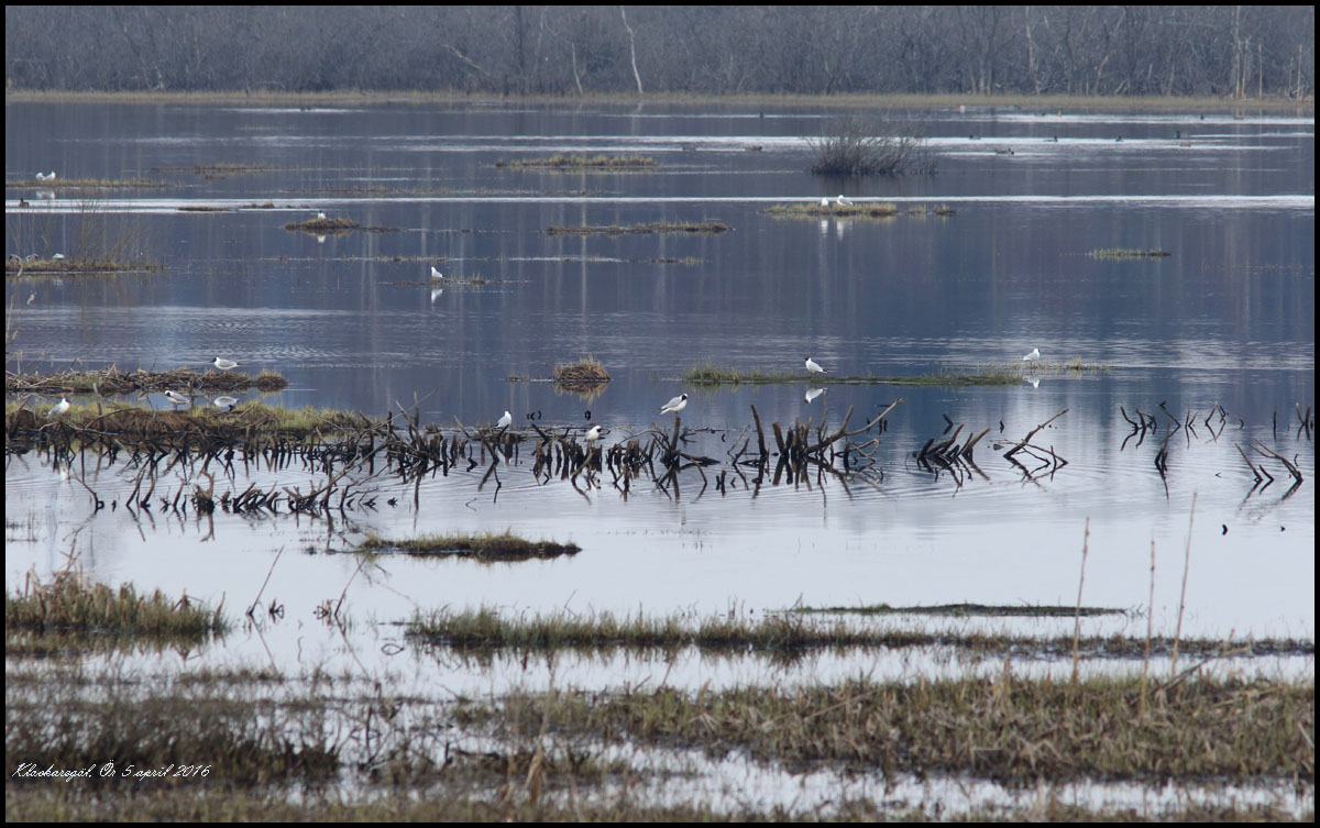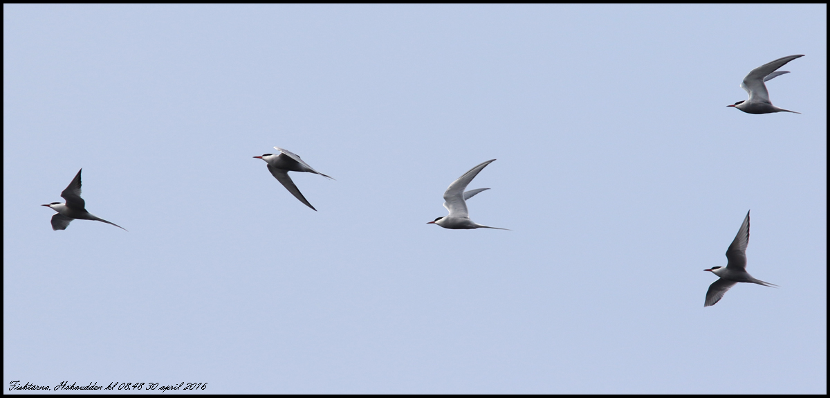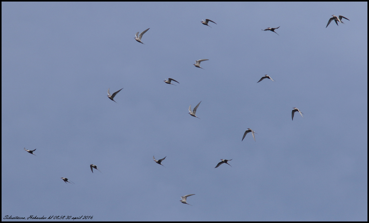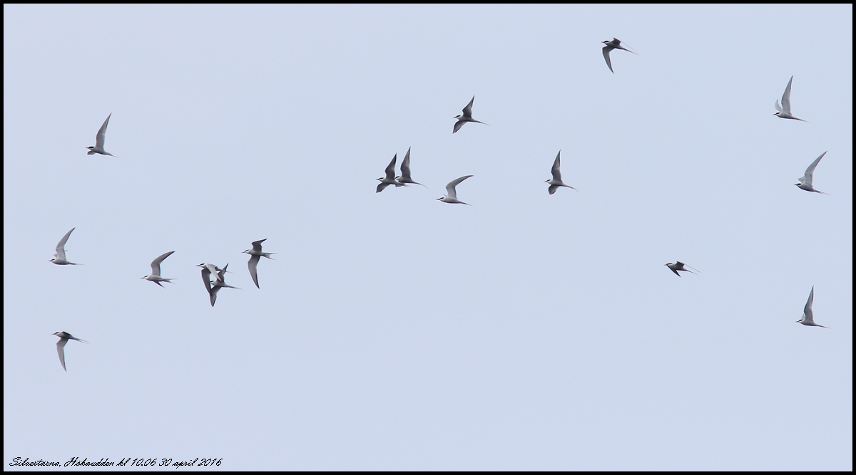30 april. Tillbaka på udden. Inga gäss idag men hundratals tärnor som sträckte mot öster under förmiddagen. De allra flesta är silvertärnor men en del fisktärnor fins också med. |