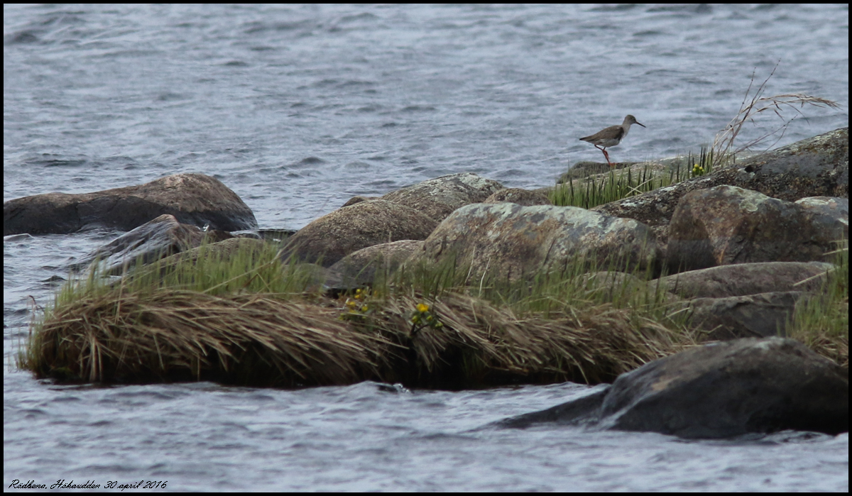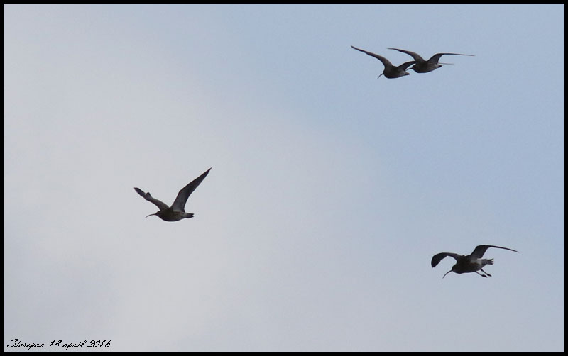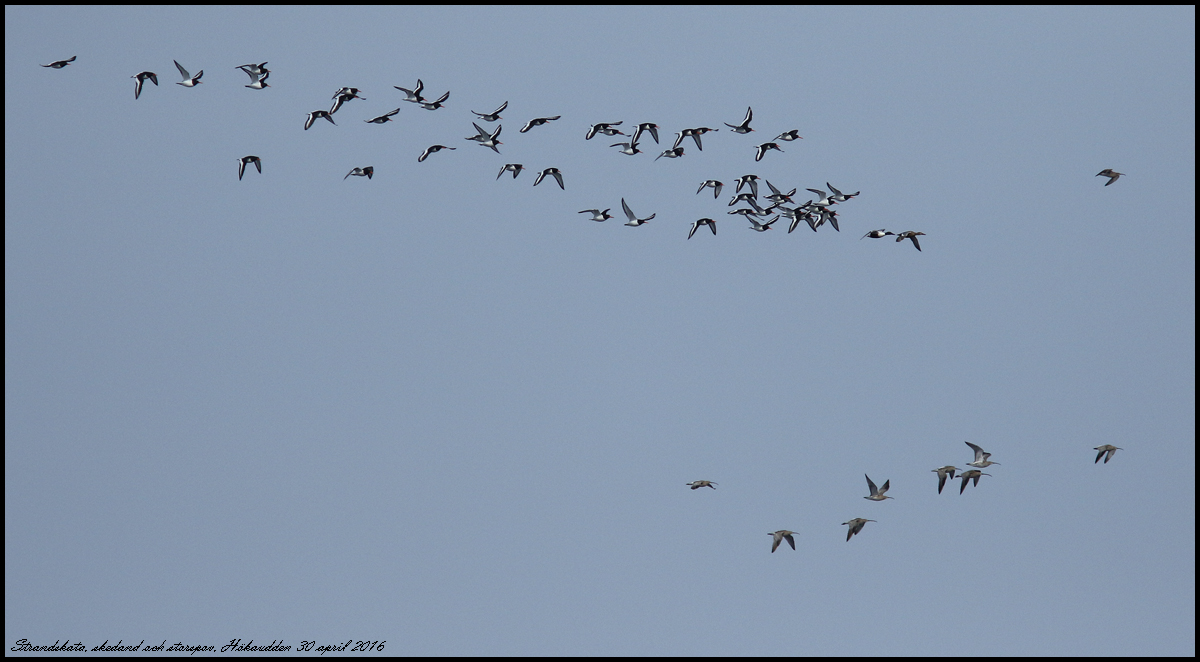 18 april. Så är man då hemma igen. Jag har förstås hamnat på Hökaviksudden. Inte så mycket fåglar i den hårda vinden men en flock storspovar stannade till. |