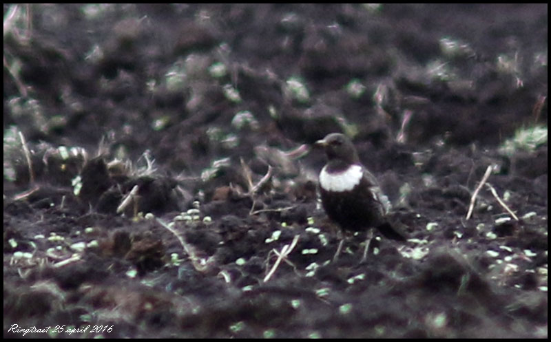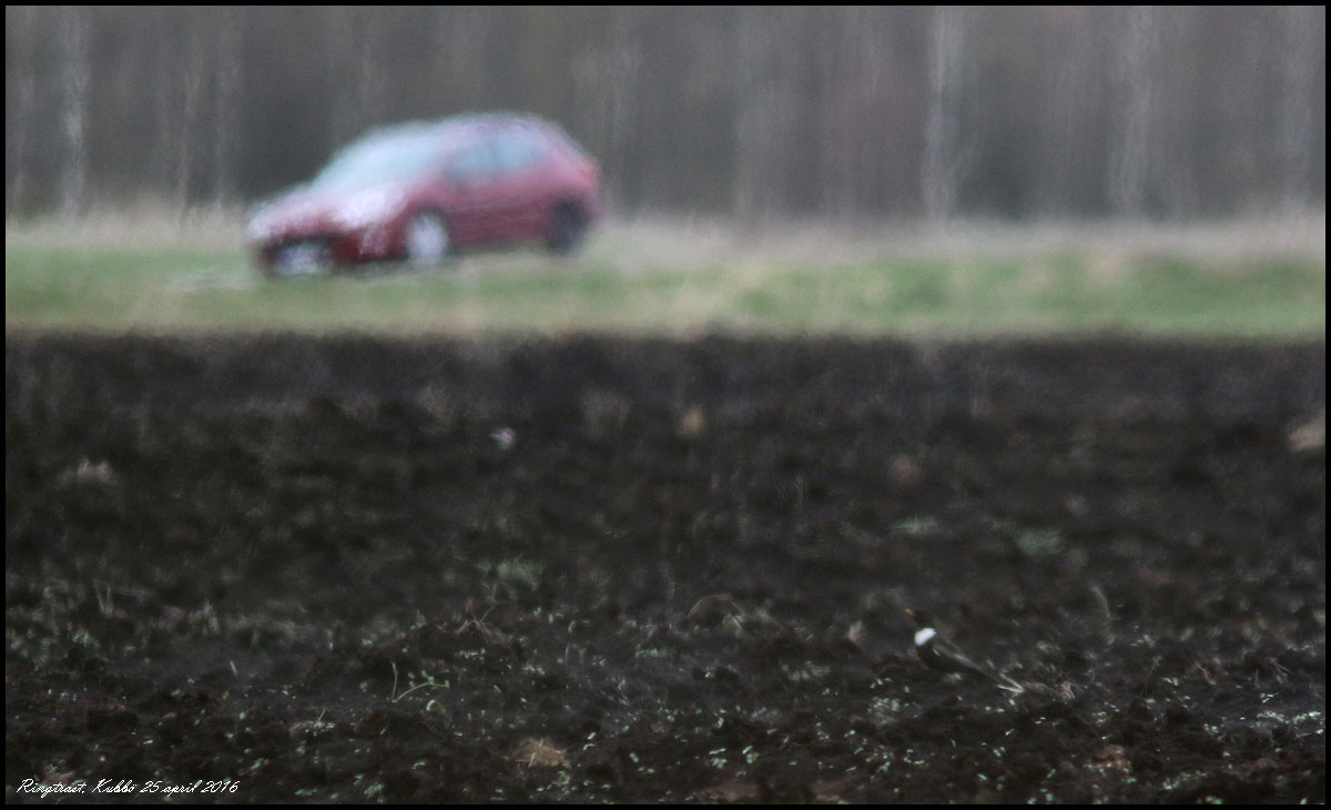 | 25 april. Vid Kubbö fanns fyra ringtrastar på en plöjd åker. Jag försökte få bilder i 1½ timme men det lyckades inget vidare. De ville inte komma nära och marken ångade efter tidigare snöfall. |