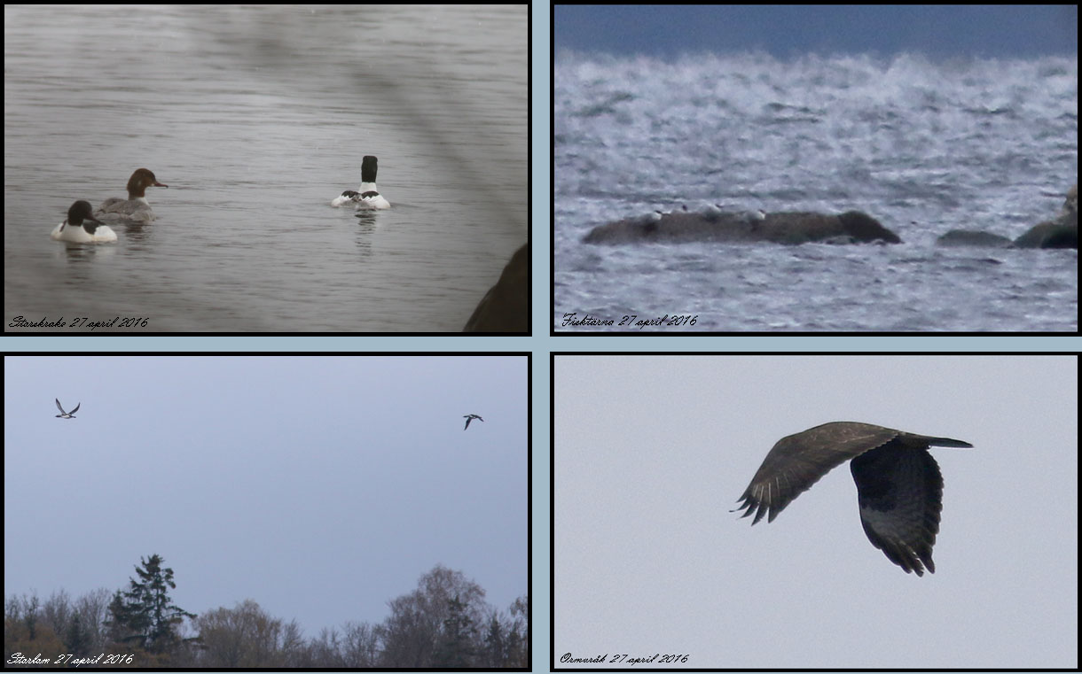27 april. Nollgradigt, östlig vind, grått och snöbyar. Våren gör en liten paus idag. Utanför Hökaudden hände inte så mycket men några fisktärnor rastade på stenarna och två ladusvalor drog norrut i snöfallet. Sedan finns ju fjordens innevånare där, storlom, storskrake, fiskgjuse m fl.