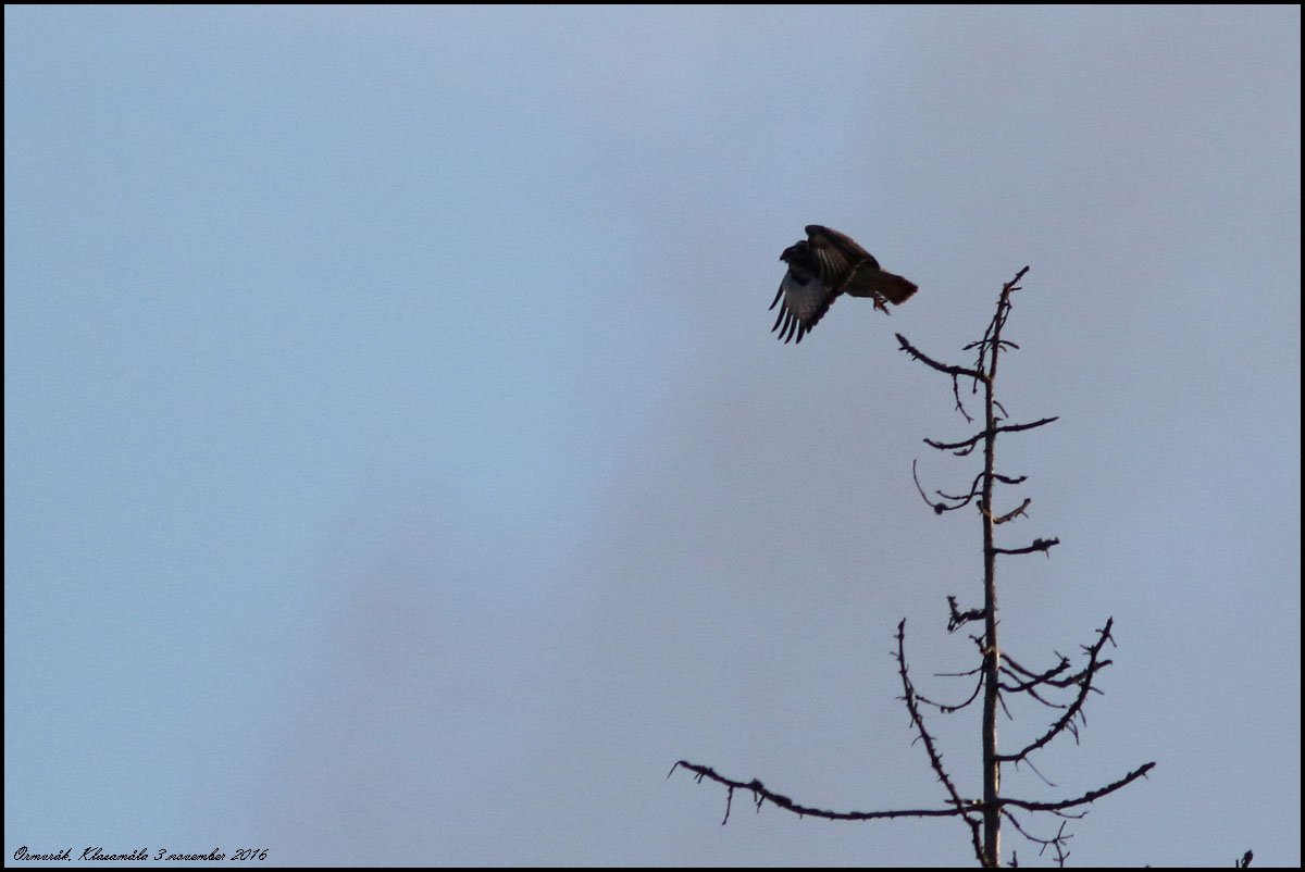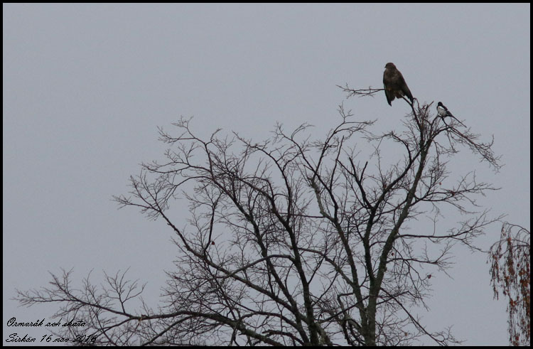 Vid Sirköbron lättade dimman. Ormvråk och skata i träd vid brofästet. |