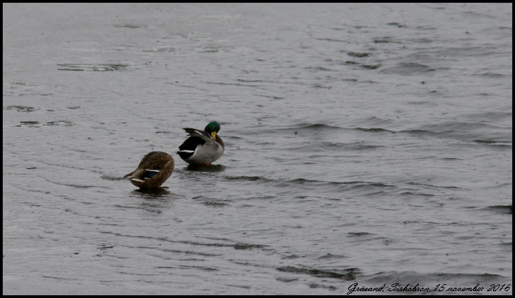 | 15 november. Den första fågelkursgruppen har besökt Bjurkärr och Sirköbron. Riktigt tråkligt väder och stora delar av sjön istäckt. Gräsänder. |