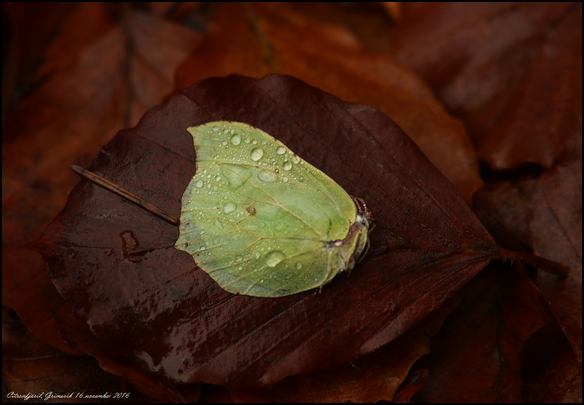 På em gick jag ut till Hökaudden. En död citronfjäril hade lagt sig tillrätta på ett boklöv. |