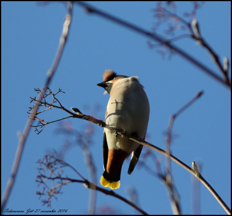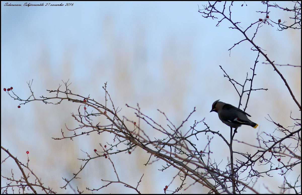 | 27 november. Det finns ovanligt mycket sidensvansar i våra trakter nu. De är riktigt härliga och piggar alltid upp, speciellt på dagar med sol och blå himmel. |
