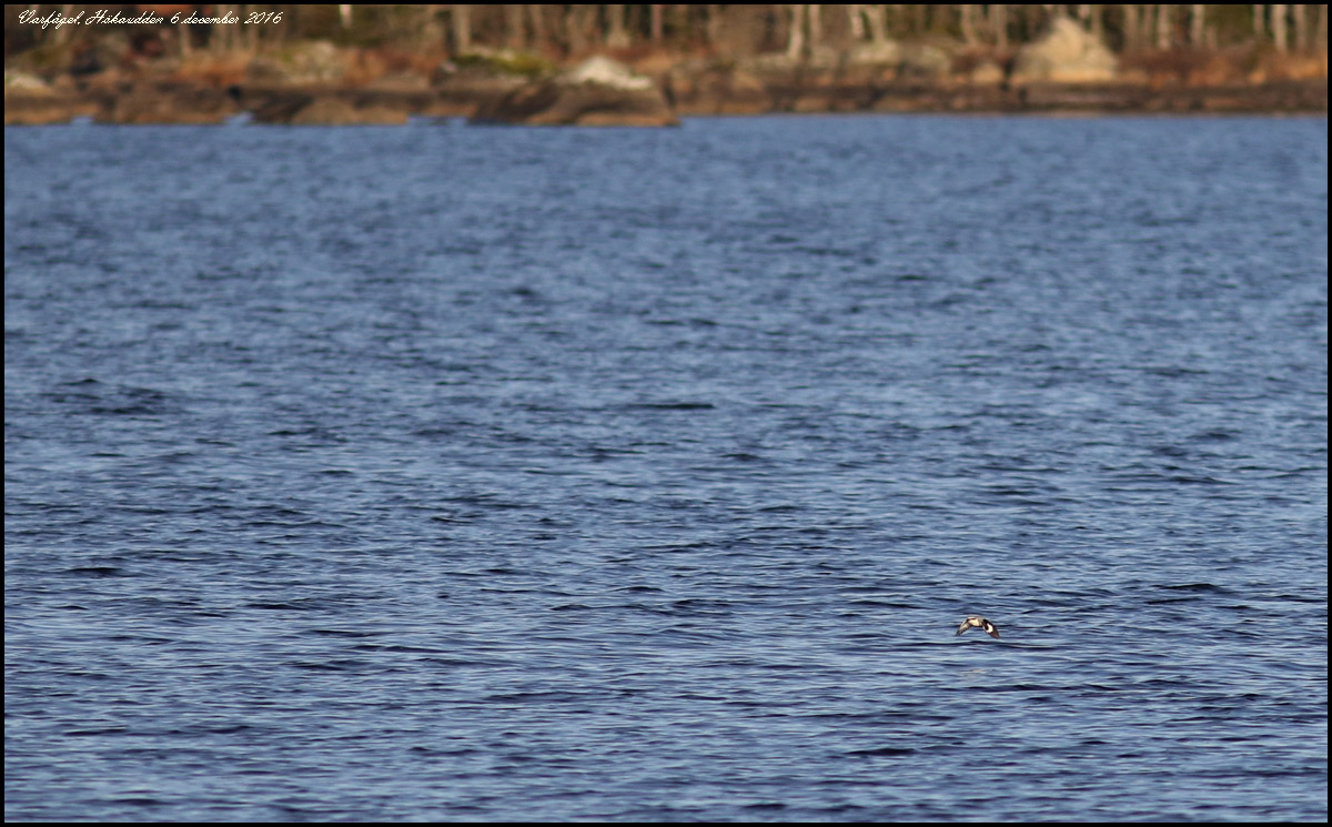 6 december. Klart väder, svag vind och några minusgrader. Hela Jätfjorden är isfri. Några tiotal storskrakar fiskade i vikarna. |