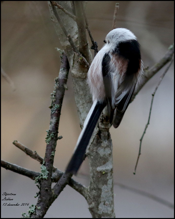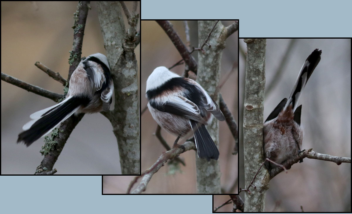 | 13 december. Några stjärtmesar kom förbi. De är riktigt svårfotograferade, speciellt i dåligt decemberljus. |