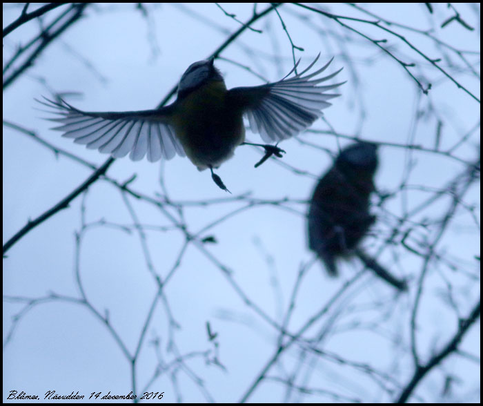 | 14 december. Jag tycker man ser många blåmesar och talgoxar nu. Ibland kan det finnas 10-15 blåmesar i samma björk, man kan nästan ta dem för siskor. |